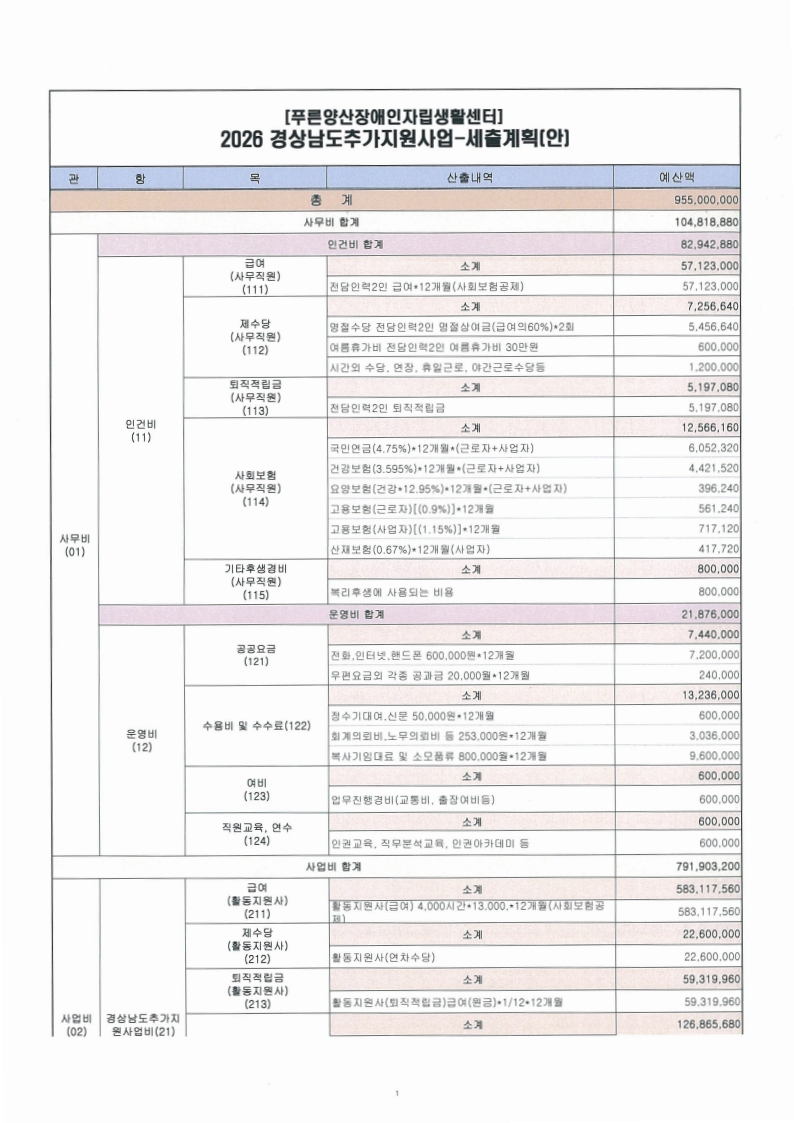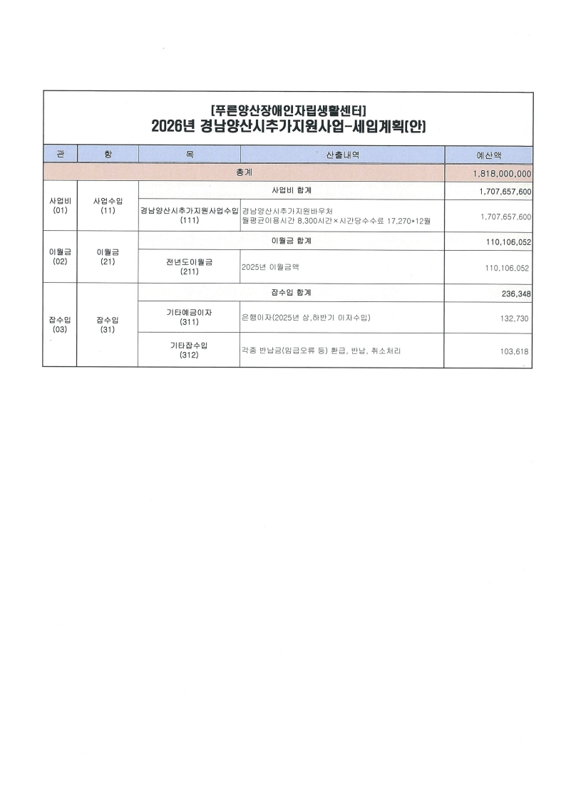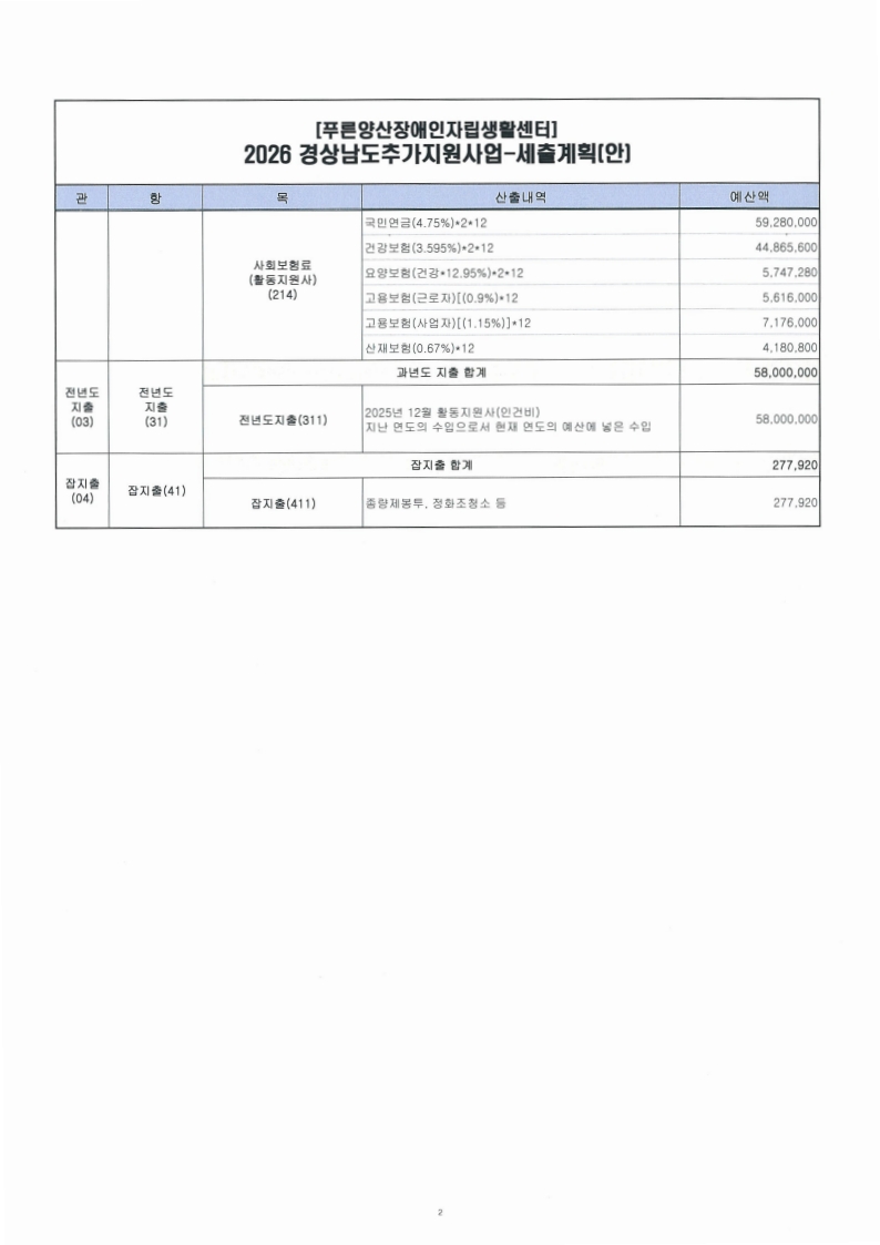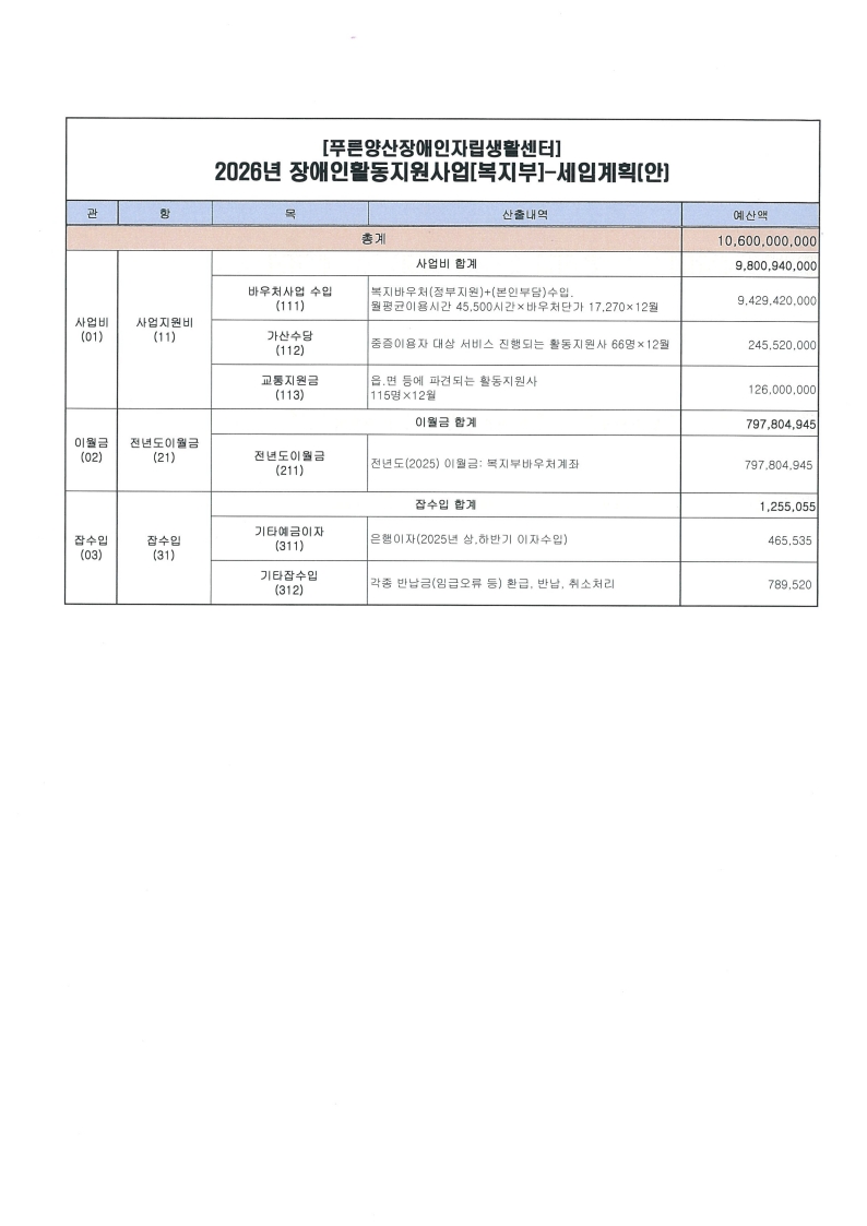 [공지] 푸른양산장애인자립생활센터 2025년도 활동지원사업 결산보고서(1~12월) 및 2026년도 수정예산 추경 공고