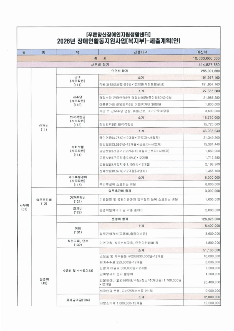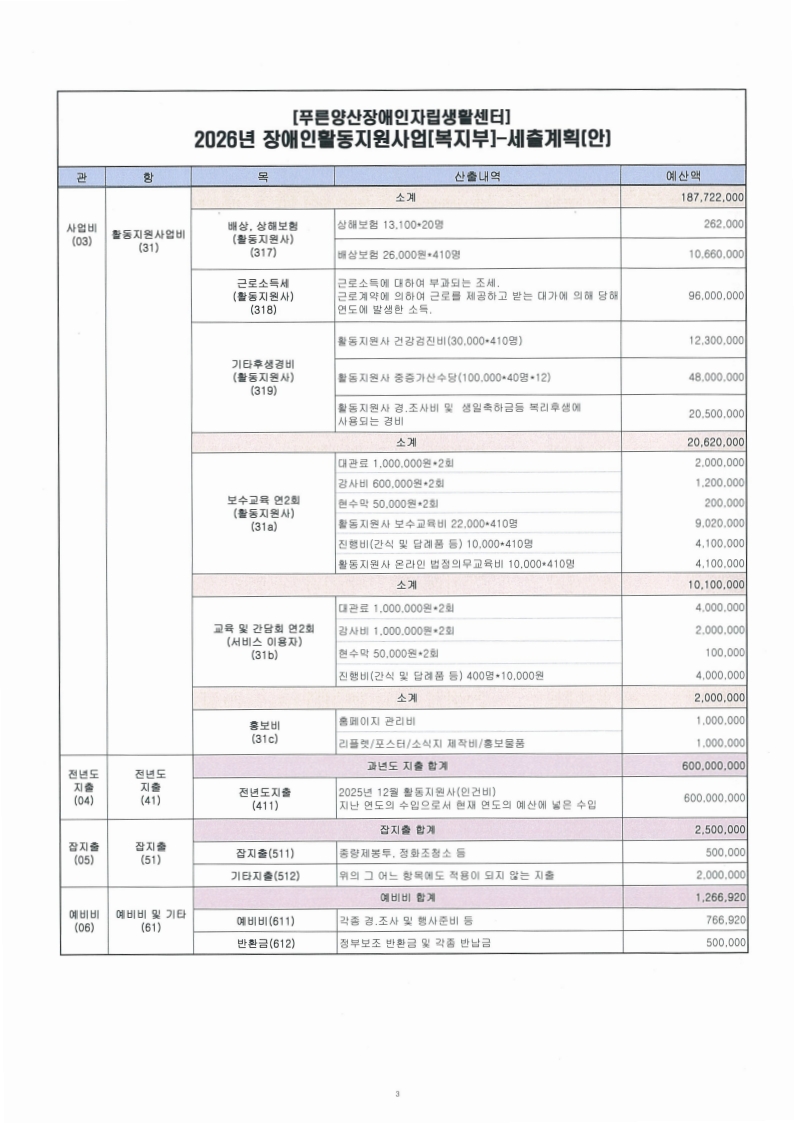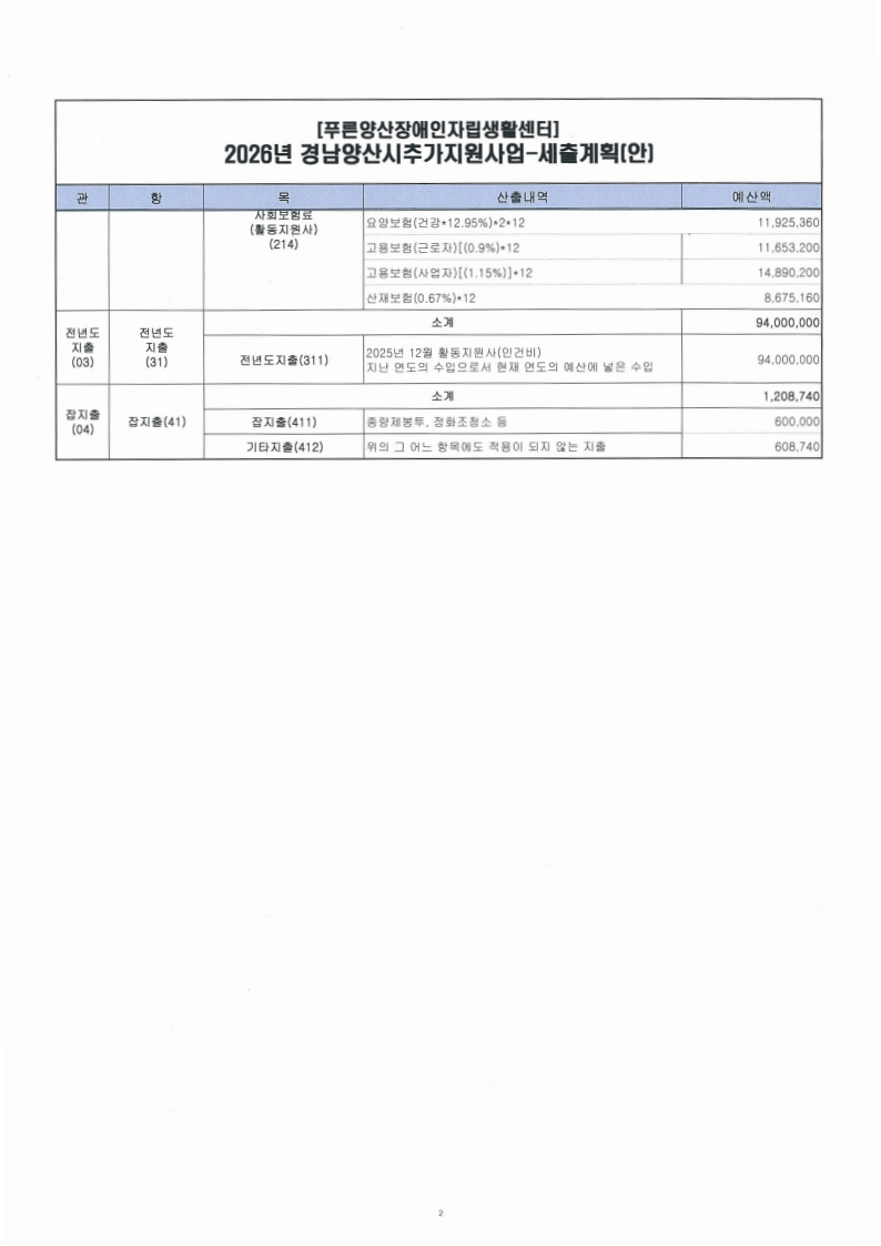 사)푸른양산장애인자립생활센터 2025년도 활동지원사업 결산보고서(1~12월) 및 2026년도 수정예산 추경에 대한 공고를 시행합니다.