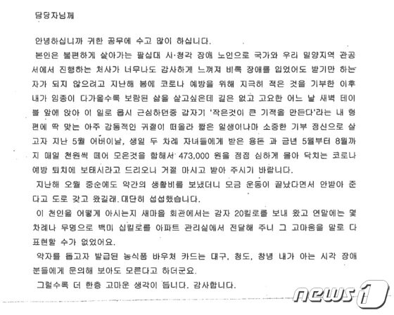 80대 장애인부부가 기부금과 함께 남긴 편지. (밀양시 제공) © 뉴스1 *출처 : 뉴스원-(https://www.news1.kr/articles/?4415444)_바로가기 |